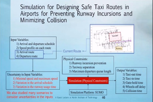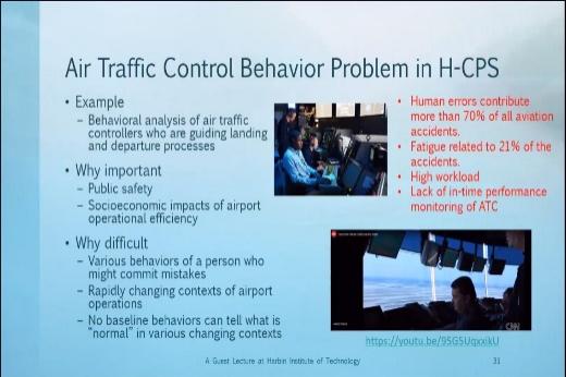 讲座课程从现场的互动、控制室互动和人与人的互动三个方面来介绍。首先,介绍了现场互动方面主要解决现场工人的可靠性问题。工人可靠性不高的危害,说明了在现场定位工人的必要性和定位工人的算法。课程通过视频展示介绍了所能做出现场展示的效果。最后总结了工人完成相应的步骤,提出了多种因素对于工人可靠度的影响系数和最终验证的试验方案。控制室的互动主要解决控制可靠性和空中交通管制员异常行为分析的问题。其次,课程介绍飞行器控制着由于高压等多种因素难免出现纰漏造成危害,确定操作者何时处于非正常状态有着重大意义。课程还介绍了个体人的特异性对于方案选择造成的难度以及预测工作压力和操作能力的方法,补充了通过预测面部表情和头部动作来预测非正常工作状态的方法。大型机场飞机飞行路线和机场摆渡车路线的最优化方案设计以避免复杂交通情况下的碰撞。之后介绍了人与人的互动主要用于解决交流的可靠性问题,难点在于难以获取现场时间发生的详细方法和难以诊断设人工操作员的操作过程,课程简单介绍了测试交流可靠性的思路,并补充了相应的试验和计算机的模拟方法。