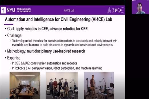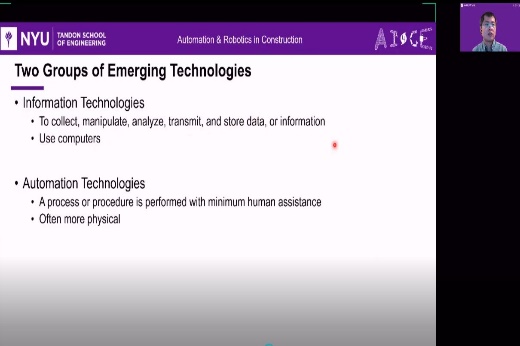 课程介绍的新兴领域construction robotics是传统土木工程、计算机视觉等学科的交叉学科,是为了发展建筑机器人领域的新理论,来解决工程实际中所碰到的问题。课程通过图片预测土木工程的未来发展趋势是建筑工地智能化和信息化。课程简单介绍了柔性机器人的安全性和抓手与建筑材料交互的技术难题。课程介绍了自动运行设备的挑战在于机器对于场景的理解,只有准确判断场景,才能保证和人交互的安全性。课程介绍了无人设备即时定位和制图的难点和应用。课程介绍了3d打印的原理和目前的效率缺陷,并介绍了未来20-30年的机器人的发展方向和发展目标。课程还介绍了智能机器人行业的发展动机,一是解决建筑行业长久以来的安全问题,二是解决建筑行业始终生产力低下,生产效率没有得到提高的发展情况,三是解决国内外富有经验的工人劳动力短缺的情况。冯晨博士列举了现有的建筑工程涉及的高新技术,将高新技术分为信息技术和自动化技术分别介绍。通过视频介绍了拍摄大量图像来进行三维场景重构的方式和通过计算机视觉和机器学习的方法来完成车辆交通的检测。