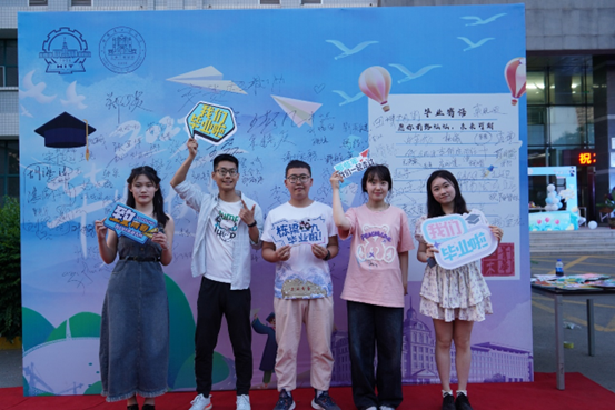 毕业生们邀请自己的老师、好友、恋人,大家盛装出席,结伴而行,一同走上象征毕业的红毯,走向无比光明的未来。大家在签名墙处驻足拍照,留下最美好的合影。
