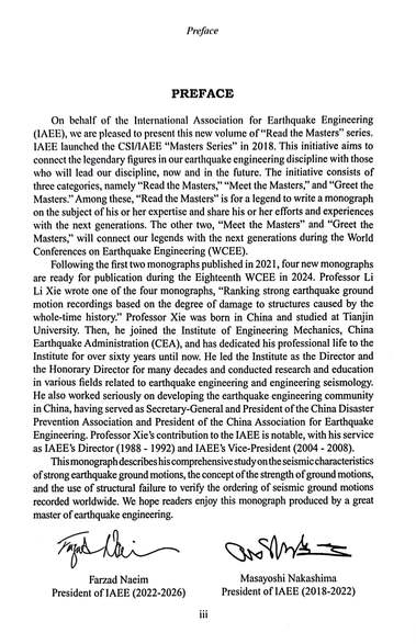 专著《强地震动按破坏强度的排序研究(ranking strong earthquake ground motion recordings based on the degree of damage to structures caused by the whole time history)》是谢礼立院士及其团队历经20余年的深入研究获得的重要研究成果。强地震动按其对结构破坏强度的排序是地震工程领域中的最基本的科学问题,100余年来虽经数十位世界著名学者对此进行了潜心研究,但由于地震发生以及由此产生的地震动的不确定性,工程结构的多样性,结构地震破坏机理的复杂性,以及结构物进入破损阶段的非线性等种种原因致使这个问题一直未能获得满意解决。谢礼立及其团队经过长期研究,针对全球十多个国家近百年来获得的数万条强地震动观测记录,对场地进行分类,对结构按自振周期分组,搞清不同结构的不同破坏机理,捋清结构非线性对结构地震响应和对地震响应排序的差异性,并在概率的基础上实现了对迄今为止观测到的数万条记录按其破坏强度进行了排序。并将得到的结果应用于各类工程结构上,得到了满意的结果,基本上解决了世界地震工程中百年来未能解决的地震动排序的难题,减少了地震动输入的不确定性。成果已经被推荐标准《建筑工程抗震性态设计通则》采用,可为基于性态和韧性的抗震设计提供不同风险水平的设计地震动。