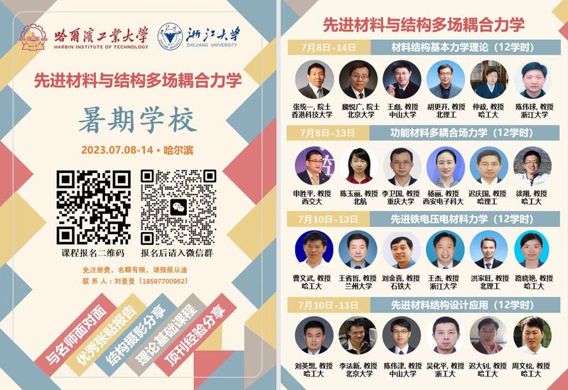 哈尔滨工业大学拟于2023年7月08-14日在哈尔滨举办“先进材料与结构多场耦合力学暑期班”。