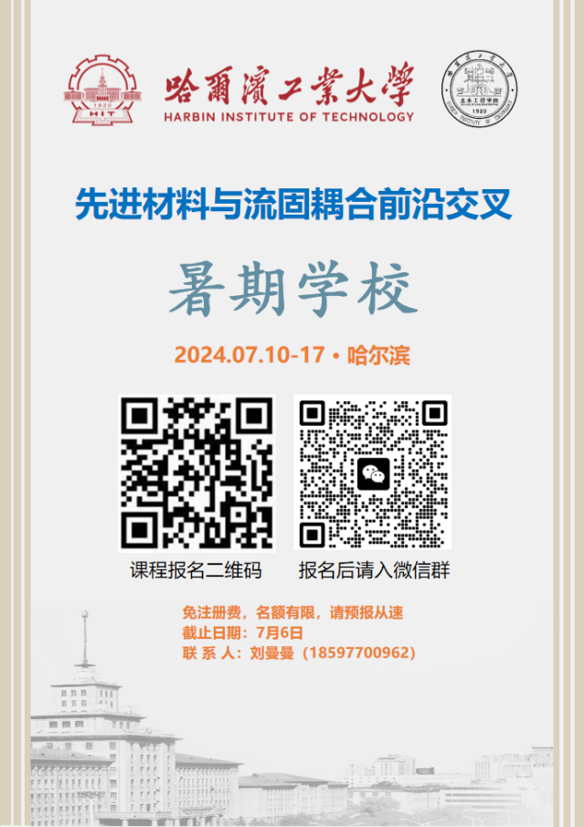 哈尔滨工业大学拟于2024年7月10-17日在哈尔滨举办“先进材料与流固耦合前沿交叉暑期学校”。