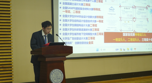 校十佳集体铸魂合唱团负责人2021级本科生朱元卓向大家介绍了校内唯一一支由学院打造的品牌学生合唱艺术团体。合唱团以“铸土木之魂,造国家栋梁”为口号,活跃于校院多级舞台,致力于校园文化美育建设。团队参与校级演出5次、院级文艺演出10余次,参演视频9个,总播放量近30000。